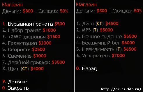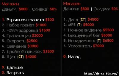 Новый Магазин для deathrunсервера со скидками. Скидка у игрока работает, если у него есть флаг t Настроить цены и процент скидки вы сможете в файле shop.cfg который находится в папке configs Если кому-то нужно сделать скидку на другой флаг, вы сами это сможете сделать изменив в исходнике доступ